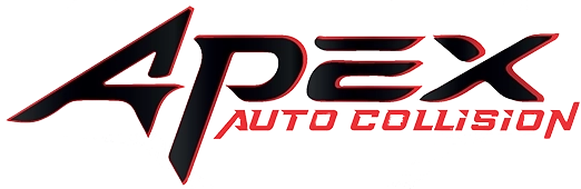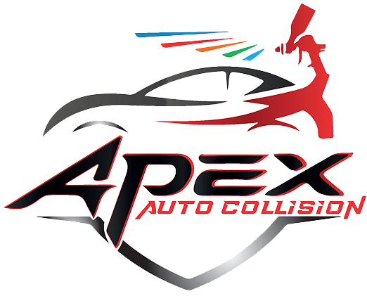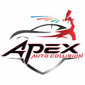 Exterior view of the Apex Auto Collision building, featuring a large metal logo with a stylized car and wings mounted on the front facade. The entrance area has stone pillars, a shaded walkway, and a glass door, with garage bay doors visible to the right. A sign for Apex Auto Sales is displayed on the corner of the building.